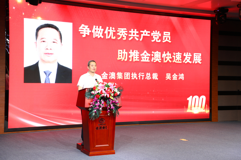金澳集团执行总裁吴金鸿同志发表了主题为《争做优秀共产党员 助推金澳快速发展》的讲话。他表示,舒心董事长10多年前就提出了“党建也是生产力”的论述,做好党的工作是公司不可或缺的重要工作。金澳的党员干部要具有讲奉献、懂感恩、善学习、求上进的独特气质和风格,要有明显区别于普通员工的工作作风。