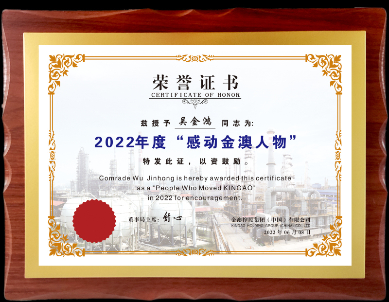 6月8日,在金澳控股集团模范表彰大会上,全国优秀共产党员、金澳控股集团执行总裁吴金鸿同志荣获集团“感动金澳人物特别奖”。