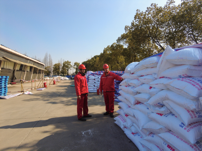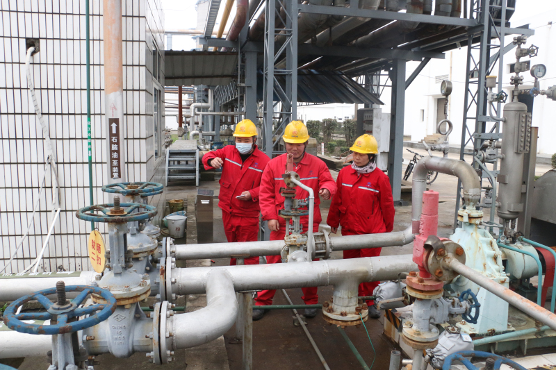 化工党支部委员、副总经理陈波带领聚丙烯车间管理员彭为,对聚丙烯仓库物料码垛情况进行现场安全检查。