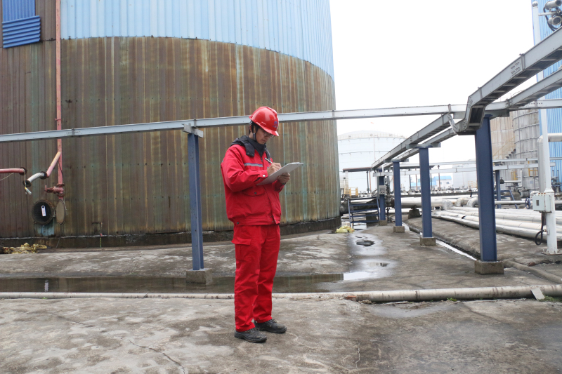 炼化党支部委员、副总经理邵清平对沥青装置稳定二中泵振动值及轴温进行监测,确保生产安全稳定。