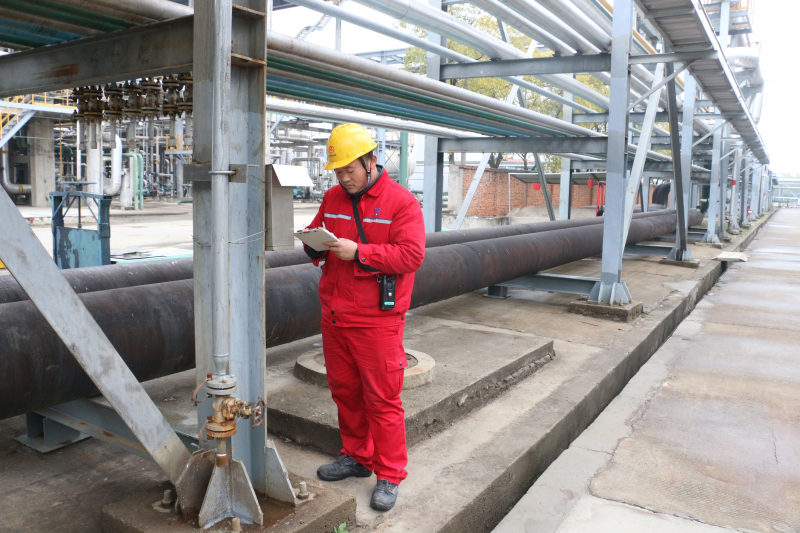 油品储运一公司油品一车间副主任郭勋在罐区查看管道阀门完好性及相关设备运行情况。