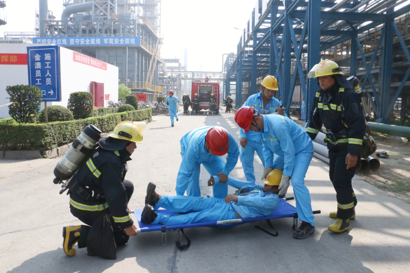 6月15日,金澳科技以加氢车间柴油加氢装置E105换热器泄露为应急演练目标,组织开展实战应急演练。公司轮值总裁、安委会主任肖生强,首席技术官、副总裁蔡明件,副总裁、安委会副主任杨巍等领导,生产调度处、设备机动处、技术研发中心、安全环保处部分干部员工参与现场应急演练。